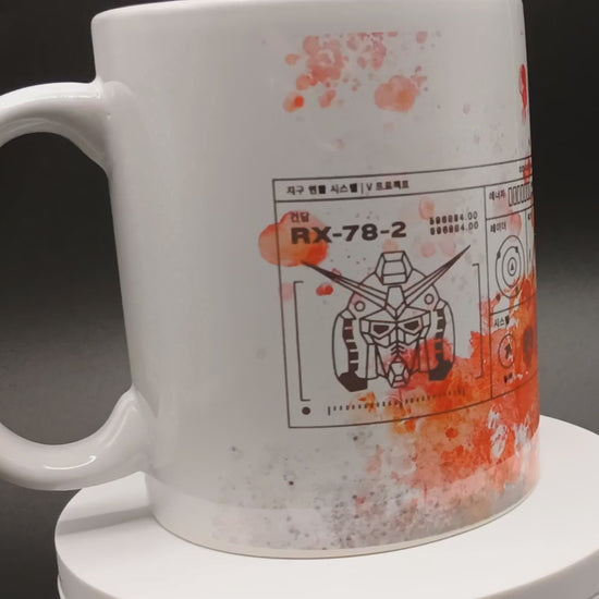 Mecha-style ceramic mug inspired by RX-78-2 Gundam. 11oz with technical schematics & abstract art. Perfect for anime fans. Dishwasher & microwave safe.
